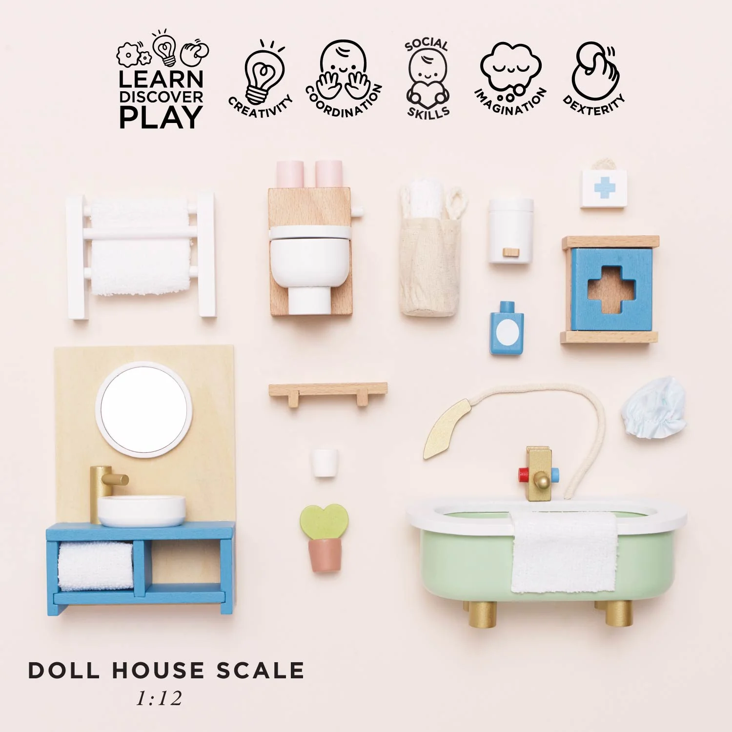 Get ready for some squeaky clean fun with this dolls house bathroom furniture set in an eye catching contemporary design. Featuring a beautiful freestanding bath, towel rail, toilet, sink unit plus a first aid cupboard and an assortment of accessories, little residents will scrub up a treat. Solid, sustainable, and stylish, this stunning set is crafted from FSC®-certified wood and is perfectly scaled to fit our full range of beautiful wooden dolls houses.