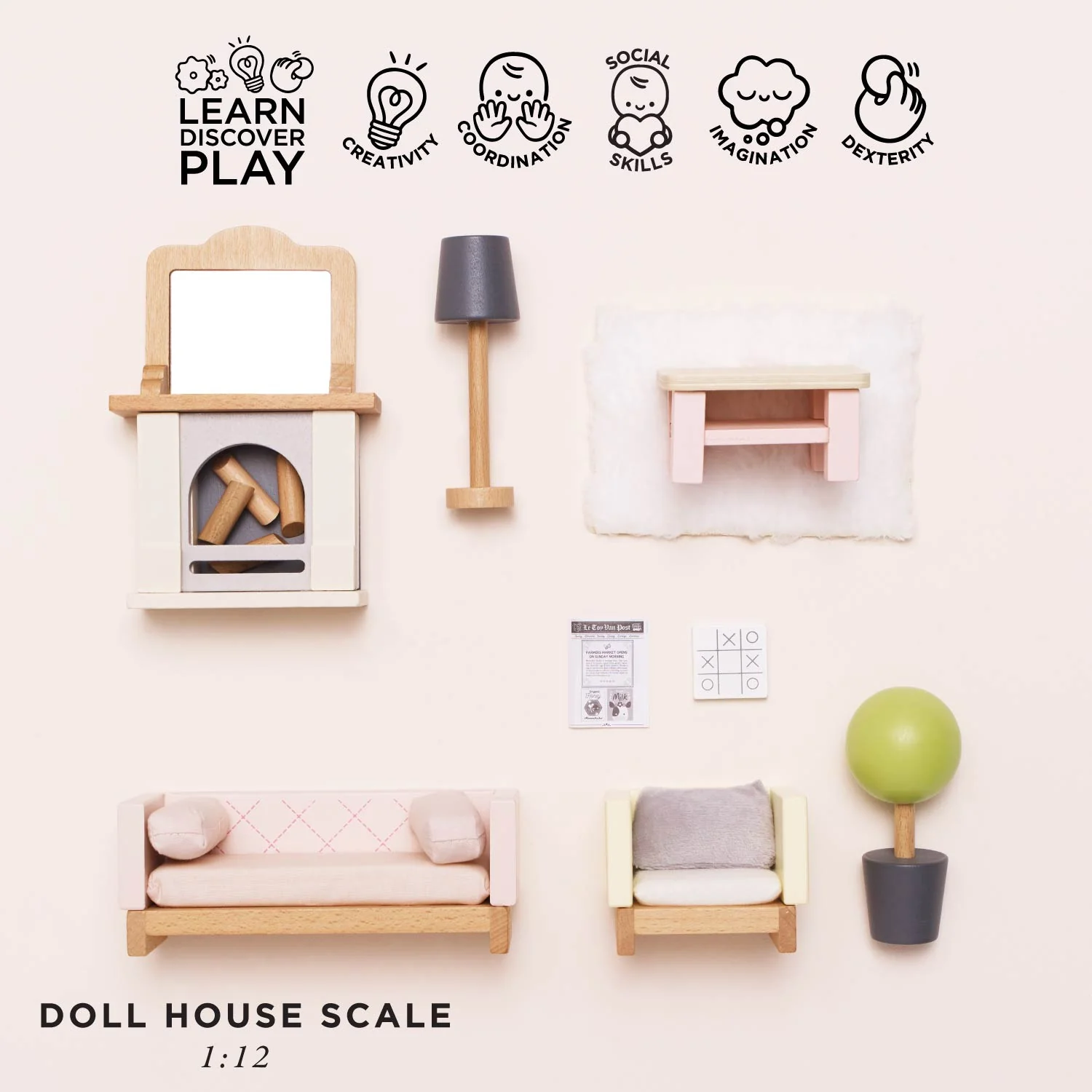 Sit back and relax with this stylish miniature sitting room, just the ticket to bring the wow factor to any child’s dream dolls house set up. Complete with 19 individual accessories, each piece is solid, sturdy and sustainable, crafted from FSC®-certified wood and built to last for generations of play.